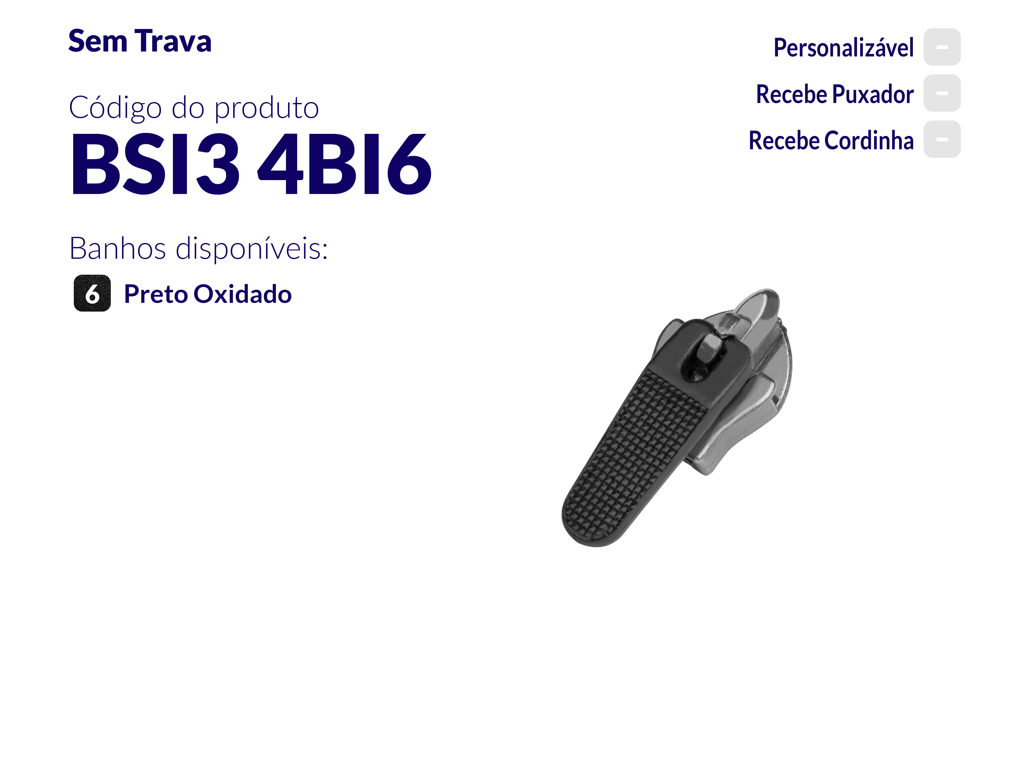 O BSI3 4BI6 é um deslizador sem trava para zíper sintético invisível, oferecendo uma solução simples e prática. A ausência de travas proporciona uma abertura rápida e fácil, adaptando-se a várias situações. Fabricado com uma liga premium composta por materiais de alta qualidade, o deslizador é robusto e durável.