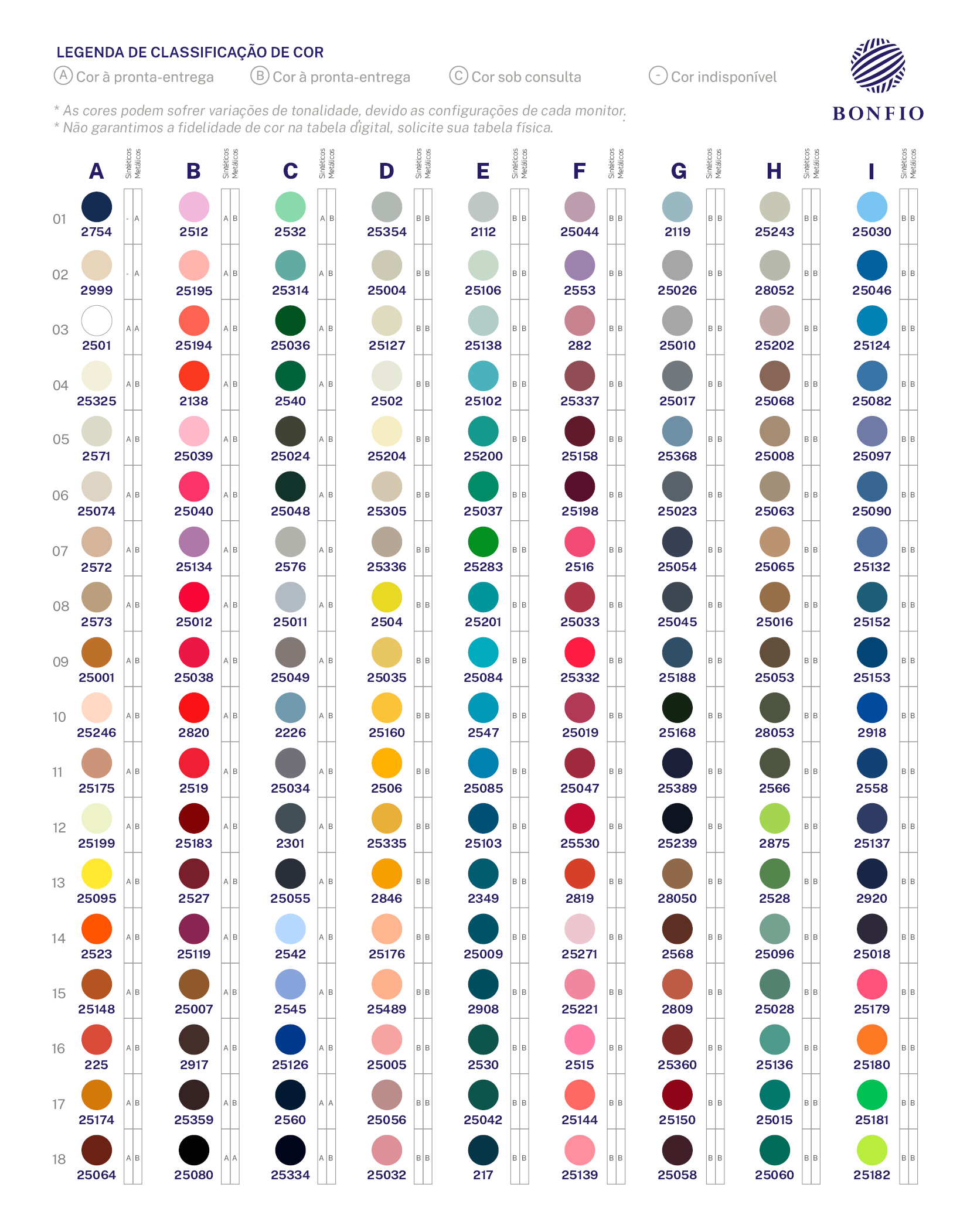Tabela de Cores BONFIO CLASSE A